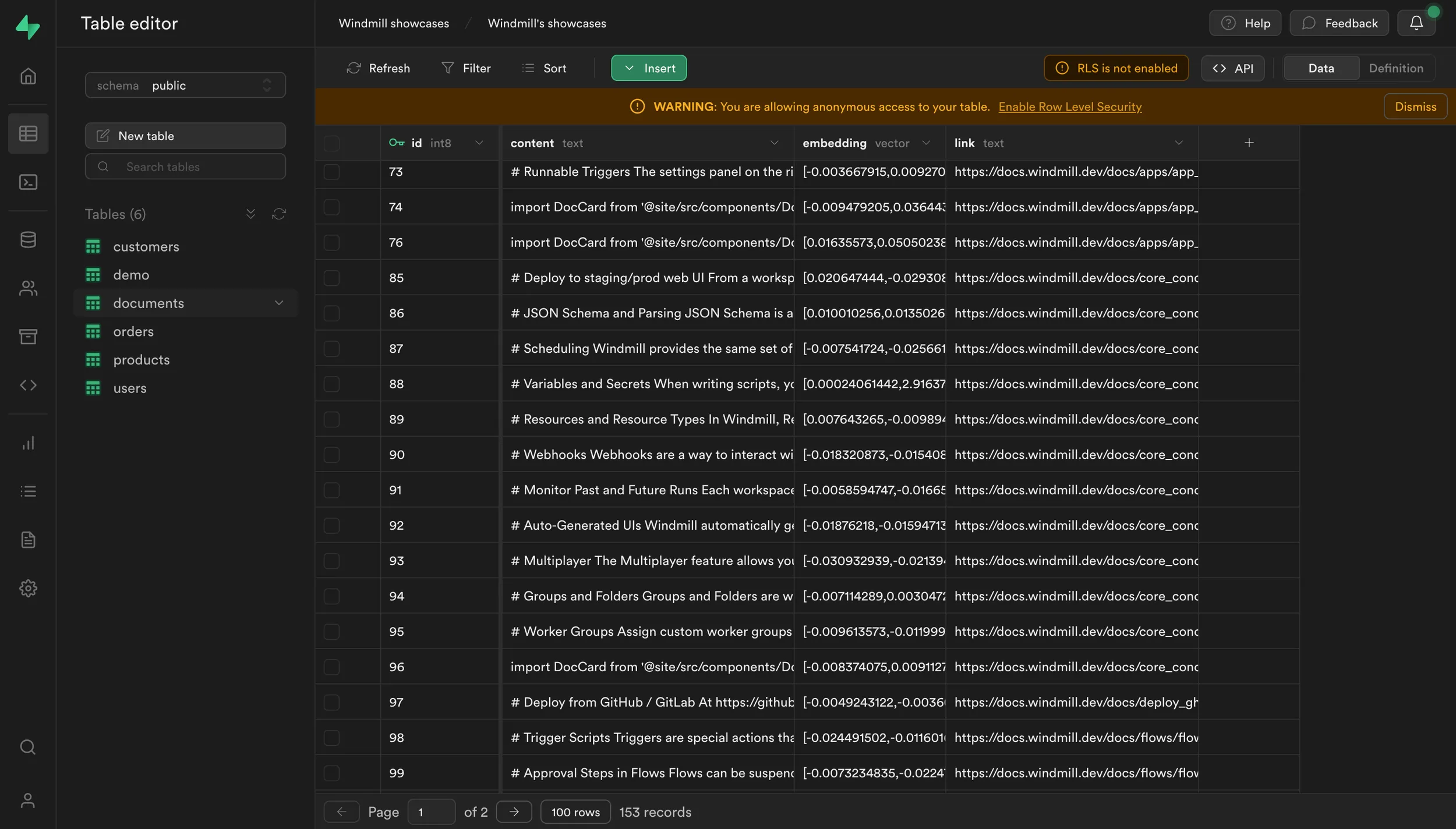 We need to ingest a data source, here the Windmill documentation. We can accomplish this by creating a scheduled flow that periodically retrieves the documentation from the Windmill repository on GitHub, creates embeddings using OpenAI, and stores the embeddings in Supabase using pgvector.