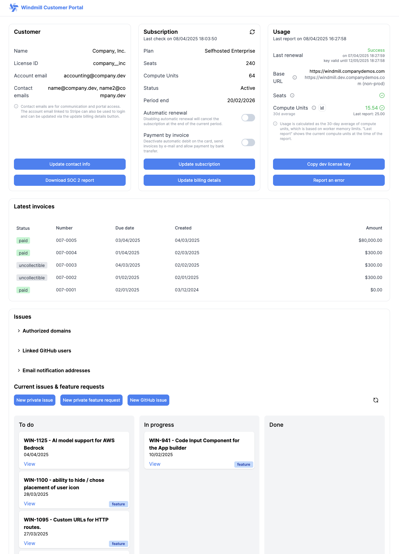 As an Enterprise user, you will have access to detailed usage information and invoices through the Windmill Customer Portal. You can update contact information, billing details and subscription (seats & workers/compute units) from the portal. The portal also displays your last license renewal result and date in the top right corner, helping you track your subscription status. If you want to monitor your usage in real time, you can 'Send usage' from your instance settings (if you have several instances, make sure to do it for each instance) and check how it converts into seats and compute units from the portal.